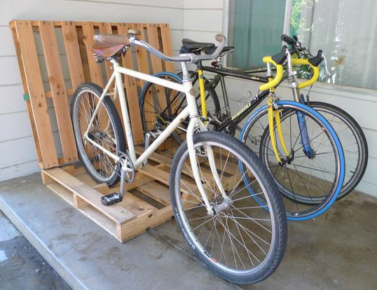 Стойка для велосипедов из поддона. Дети, отдыхающие с вами на даче летом, наверняка катаются на велосипедах по округе. Сделайте для их транспорта подставку — их это порадует.
