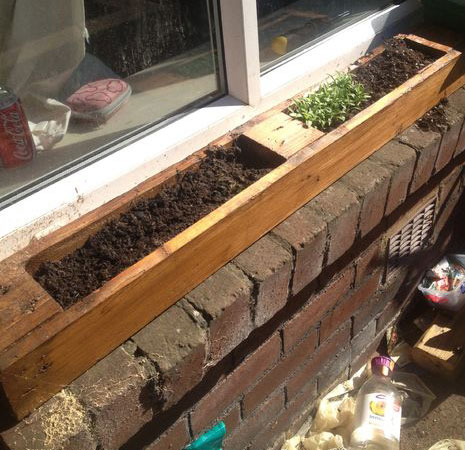 Стол с лотком для цветов из поддонов. Можно кушать и созерцать красоту цветов. Перед засыпкой грунта следует проложить стенки и дно лотка гидроизоляцией.
